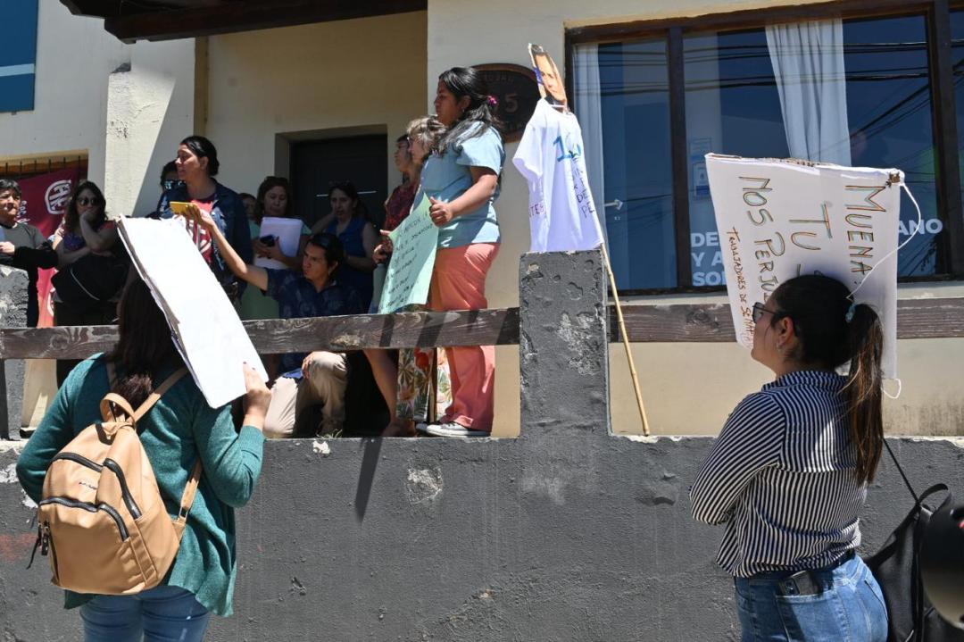 La dirigencia se ubicó afuera del edificio de la delegación oficial con carteles apuntando al ministro Juan Pablo Muena e ingresaron a la oficina del delegado Maximiliano Iglesias con quien mantuvieron un diálogo.