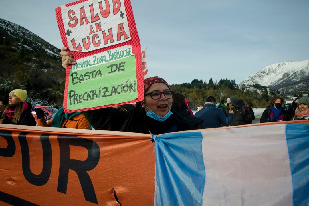 A pocos metros del puesto de la policía, unos 40 trabajadores de la salud encabezaron el reclamo con carteles, bombos y hasta una cacerola. «Pedido de audiencia con la gobernadora», se leía en una pancarta.