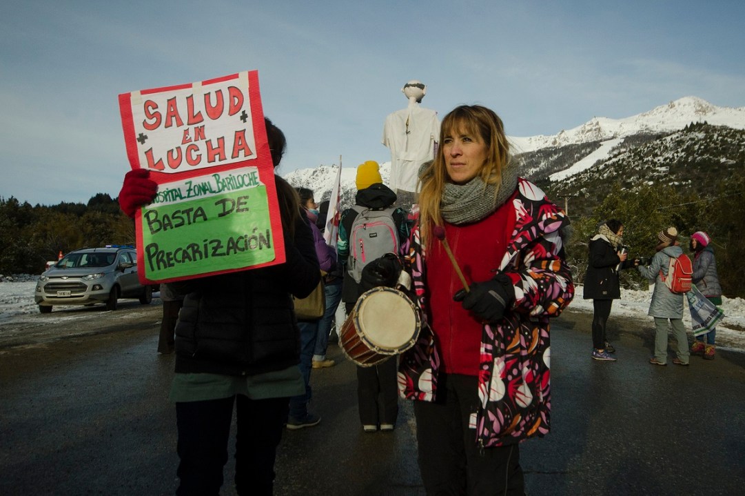 En Bariloche, esta vez los hospitalarios decidieron bloquear de manera intermitente, permitiendo el paso de manera eventual a los vehículos, en la ruta Carlos Bustos a escasos metros del puesto de la Policía de Seguridad Vial, en el acceso al cerro Catedral que hoy habilitó sus pistas y medios de elevación tras una montaña cerrada ayer por el riesgo de avalanchas.