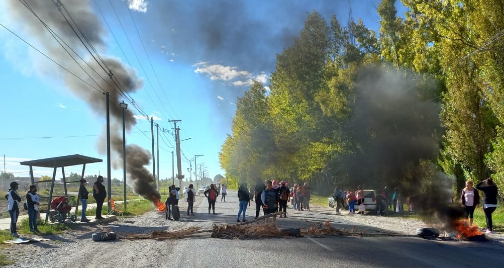 La ruta provincial 65 permaneció totalmente bloqueada al tránsito gran parte de la mañana a la altura de la calle Juan Tarifa de Allen, con quema de gomas y movilización.