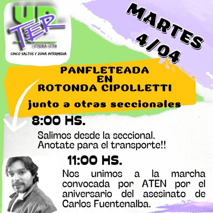Este martes, 4 de abril, distintas organizaciones se concentran en torno a la jornada de memoria y reclamo de justicia por el crimen de Carlos Fuentealba. El docente fue asesinado, hace 16 años, durante una protesta en Arroyito. En este contexto, distintas seccionales de Unter llamaron a una manifestación en los puentes que unen Neuquén y Cipolletti, para, luego, sumarse a la marcha central en el centro neuquino.