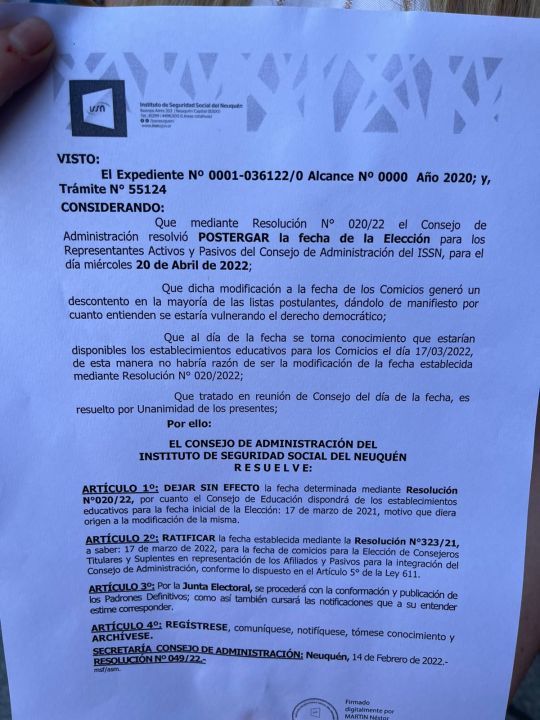 Este lunes, ATE realizó el paro y la marcha anunciadas e indicó que el presidente del Consejo de Administración de ISSN, Néstor Martín, les confirmó la realización de la sesión extraordinaria. Dos horas después, el sindicato envió la resolución que suspendía las elecciones el 20 de abril y las volvía a programar para el 17 de marzo.