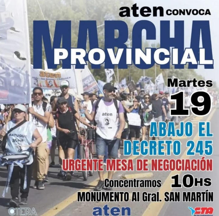 Las medidas de fuerza se resolvieron en el plenario de ATEN este sábado. El miércoles 20 se desarrollará una permanencia en el monumento a San Martín y el jueves 21, tendrán lugar asambleas en todas las seccionales.