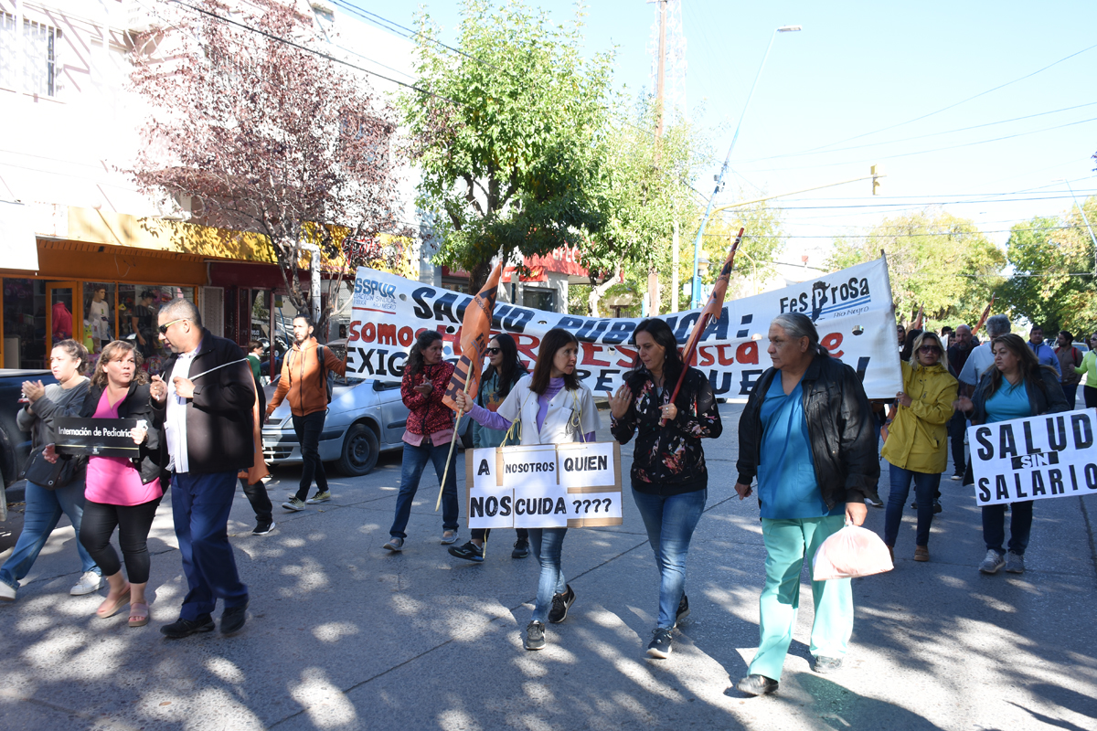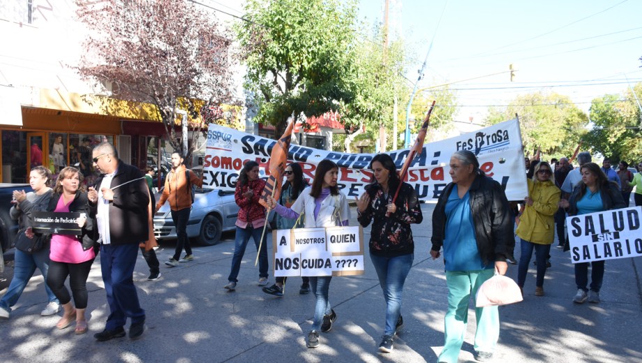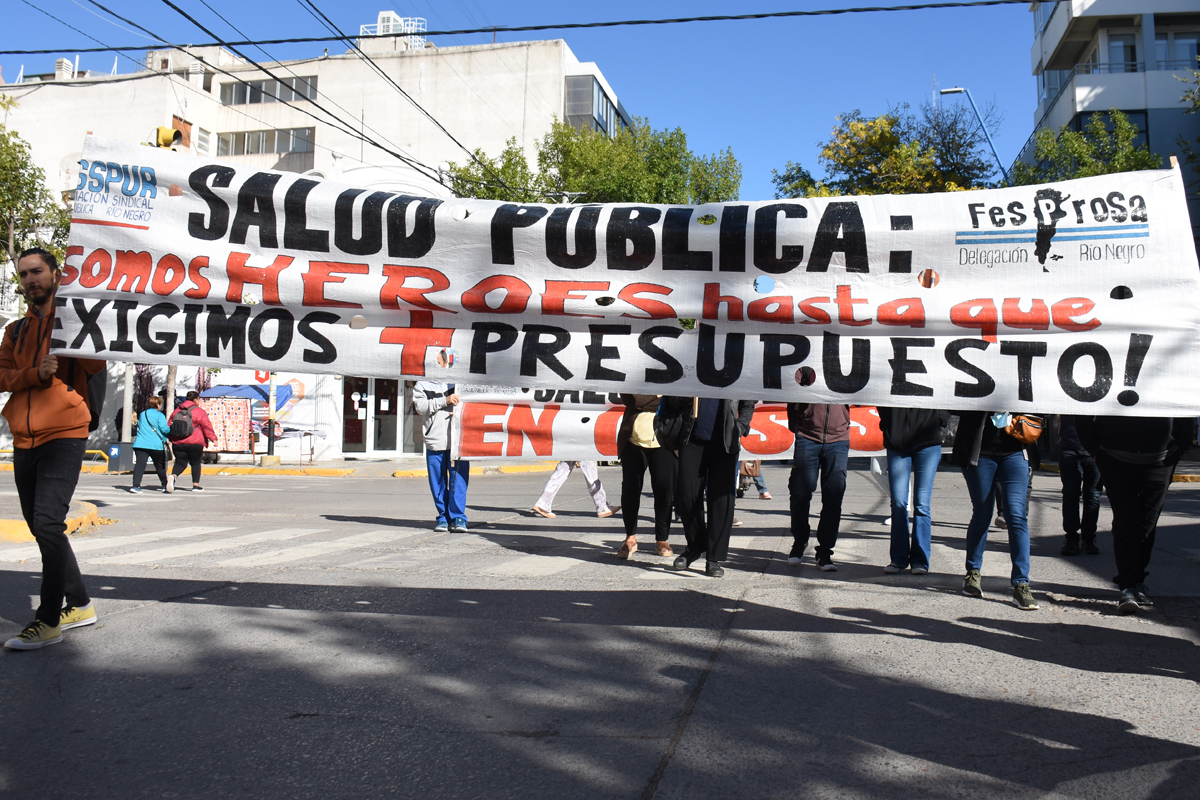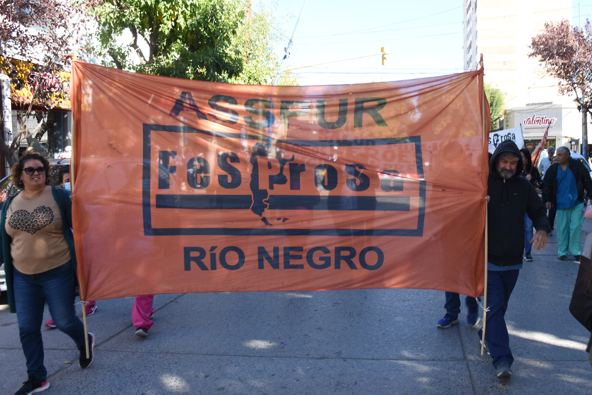 Luego de una asamblea que se llevó a cabo en el mástil del Hospital Francisco López Lima, personal de salud nucleado en la Asociación Sindical de Salud Pública de Río Negro (Asspur) marchó por calle Tucumán desde Avenida Roca hasta calle Belgrano.