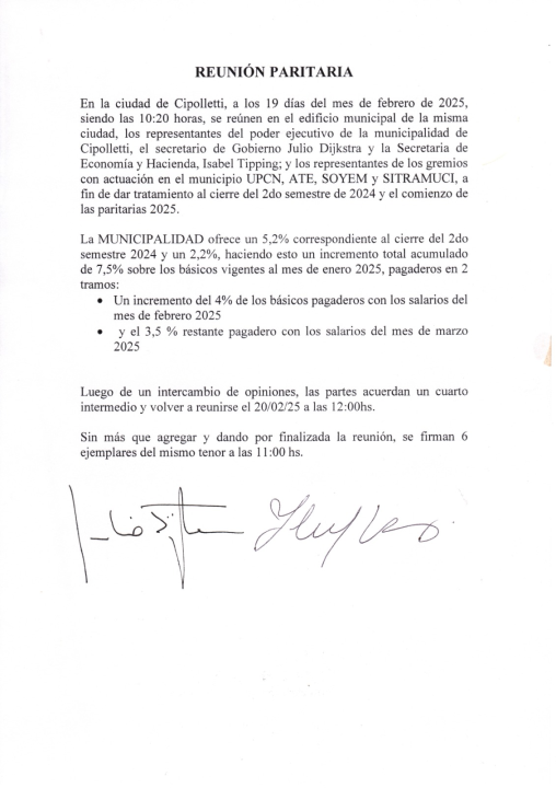La instancia de diálogo con el Ejecutivo cipoleño había sido pautada para este miércoles a las 10. En el encuentro se hizo presente el flamante secretario de Gobierno, Julia Dijkstra, la secretaria de Economía y Hacienda, Isabel Tipping, y representantes de ATE, UPCN, Soyem y Sitramuci.