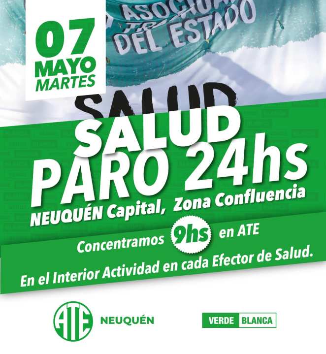 El gremio Asociación de Trabajadores del Estado (ATE) de Neuquén convocó a un paro de 24 horas este martes en Salud. La medida de fuerza contempla una concentración y afectará el servicio sanitario de varios establecimientos públicos de la provincia.