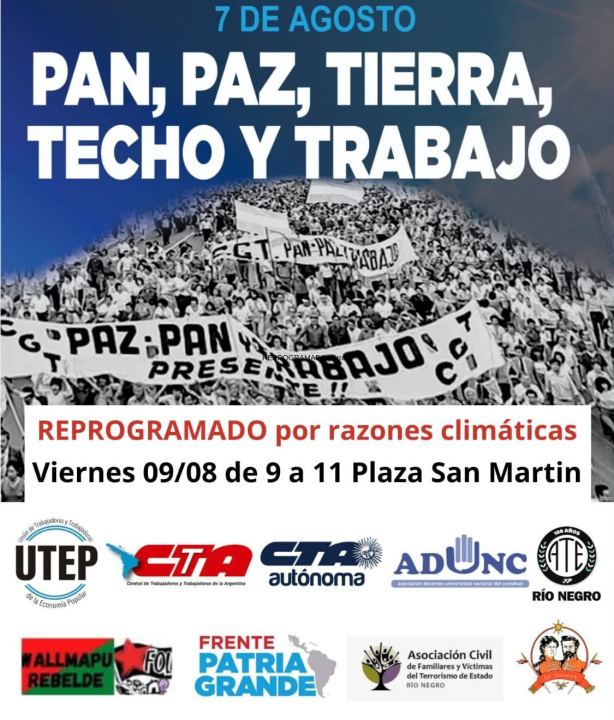 La copiosa lluvia de este miércoles y el alerta amarilla obligó a suspender la actividad que se postergó para el viernes, a partir de las 9, en la Plaza San Martín de la capital, con el acompañamiento de diversas organizaciones y sindicatos.