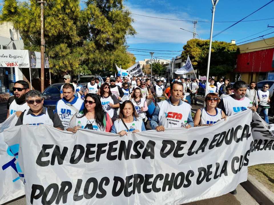 La protesta, encabezada por los máximos dirigentes del gremio, se concentró en la rotonda Islas Malvinas y desde allí marchó por Caseros-25 de Mayo hasta la zona céntrica de la ciudad para recorrer las sedes centrales de los Ministerio de Trabajo y de Educación.