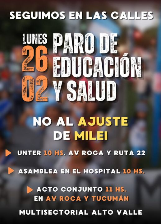 «Adherimos al paro planteado a nivel nacional para este lunes 26 de febrero. La medida tiene lugar luego del rechazo, por insuficiente, a la oferta salarial del Gobierno rionegrino, que propuso el pago de un bono por única vez de $80.000 a $95.000 y $115.000 según categoría y agrupamiento, a pagarse en marzo por planilla complementaria», explicaron en redes sociales.