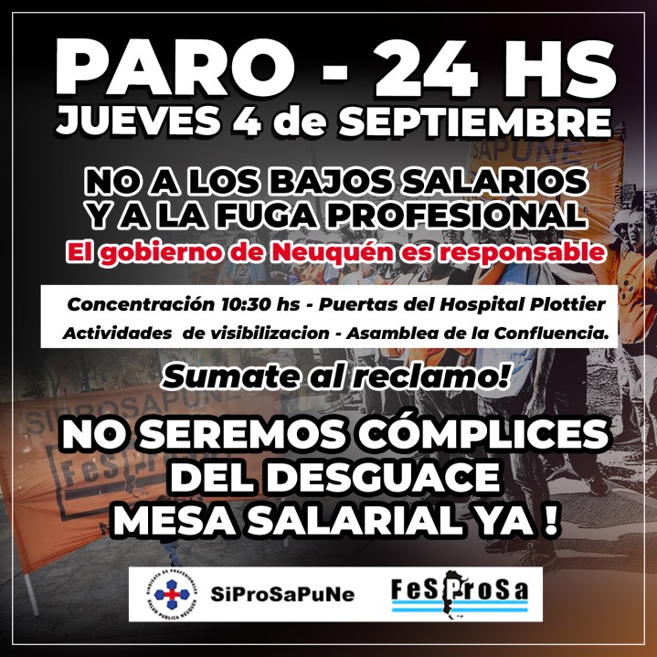 Desde Siprosapune lanzaron la convocatoria en su página oficial. Bajo el lema de «Decimos no a los bajos salarios, decimos no a la fuga profesional», anunciaron un paro que afectará los hospitales neuquinos y además anunciaron actividades.