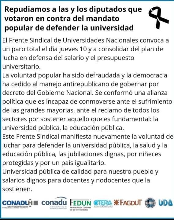«Repudiamos a las y a los diputados que votaron en contra del mandato popular de defender a la universidad», expresaron en el mismo comunicado. También criticaron al Gobierno por sostener la iniciativa del presidente de vetar la ley de financiamiento pese al reclamo de todos los sectores.