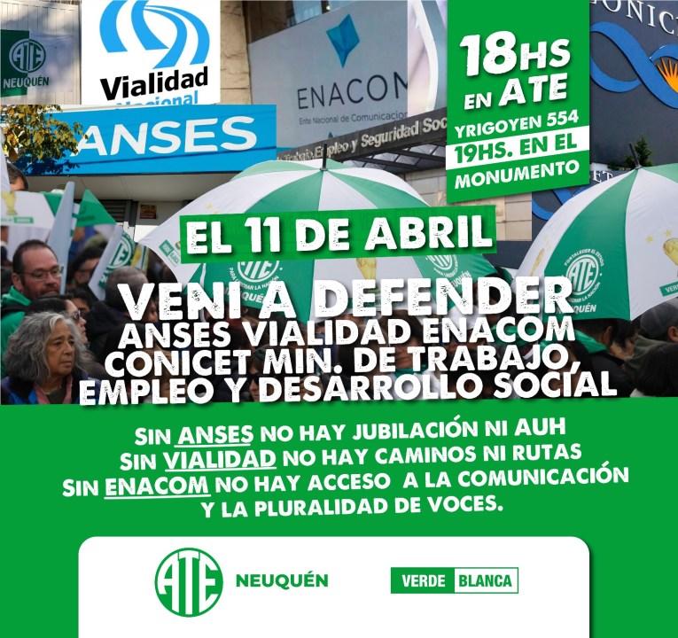 Por su parte, ATE Neuquén anunció una concentración seguida de una marcha este jueves, en horas de la tarde, para expresar su rechazo a las múltiples desvinculaciones que se dieron en las dependencias locales de organismos nacionales como Anses, Vialidad Nacional, Enacom y Parques Nacionales.