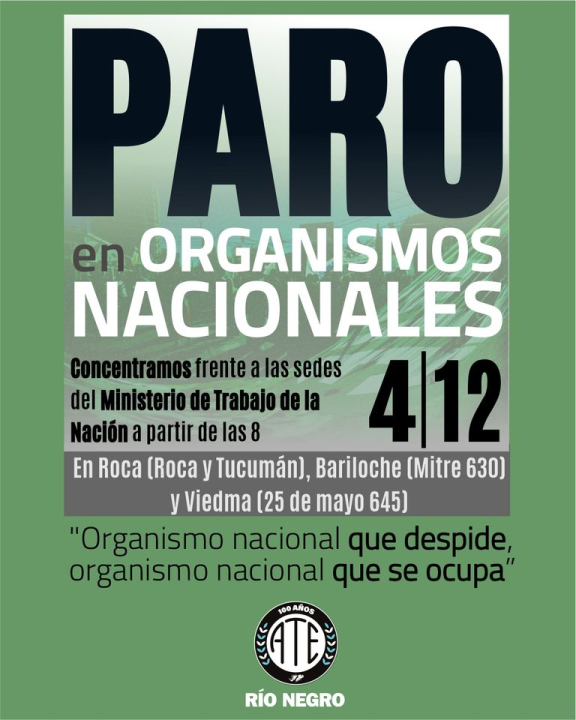 El sindicato lanzó una advertencia «organismo nacional que despide, organismo nacional que se ocupa». Hubo concentraciones en la sedes del Ministerio de Trabajo de la Nación a partir de las 8 de este lunes en General Roca (Roca y Tucumán), Bariloche (Mitre 630) y Viedma (25 de mayo 645).