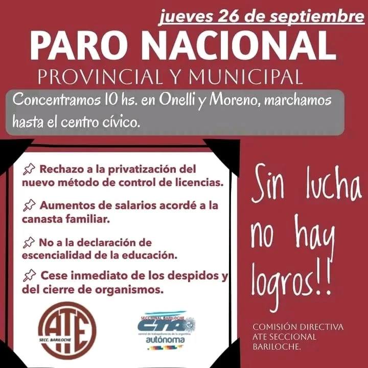 Por su parte, el gremio estatal ATE protagoniza un paro nacional este jueves 26 de septiembre. Realizaron cortes en el centro de Roca y marchas en Viedma y Bariloche. Además, hay retención de tareas en dependencias estatales.