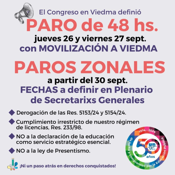 En ese contexto, el gremio definió dos días de paro para este jueves 26 y viernes 27 de septiembre, con una gran movilización en la capital provincial el primer día de huelga.