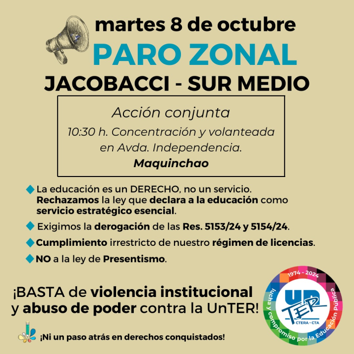 El gremio Unter continúa con paros zonales en Río Negro. El detalles de las ciudades afectadas y los reclamos docentes. ¿Hay nuevo Congreso?
