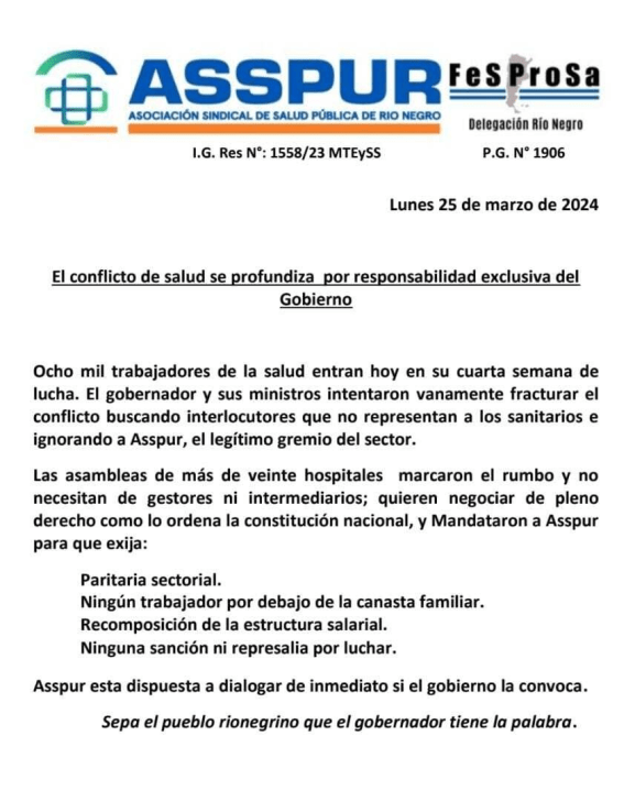 Hubo asambleas en más de veinte hospitales, donde los trabajadores de la Salud buscaron dejar en claro que desean negociar directamente con el Ejecutivo de Río Negro. «Asspur ha sido mandatada para exigir una paritaria sectorial, salarios que superen la canasta familiar, recomposición salarial y garantías de no represalias por parte del Gobierno», indicaron desde el sindicato.