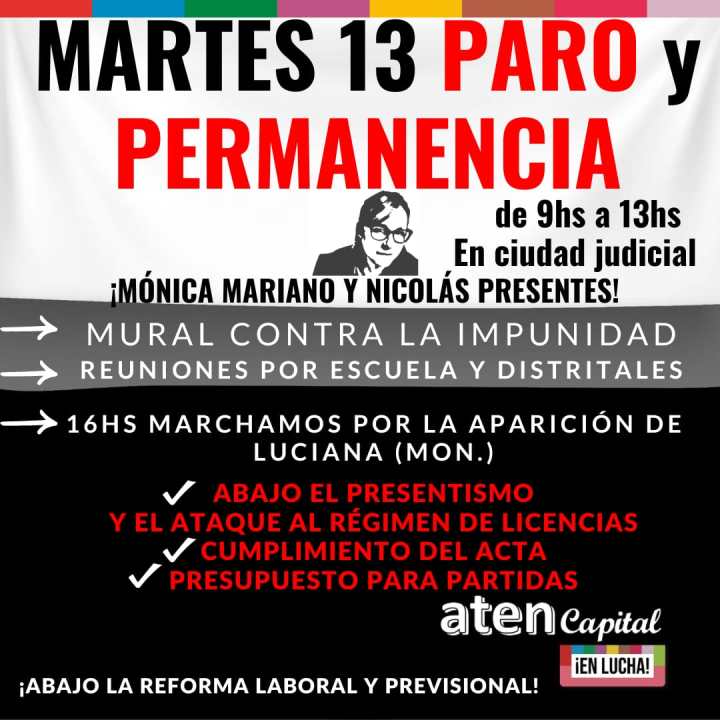 En este sentido desde las 9 y hasta las 13 realizaron una permanencia en el edificio judicial para continuar acompañando el juicio. «¡Mónica Mariano y Nicolás presentes!», expresaron. También detallaron que hará un mural contra la impunidad.
