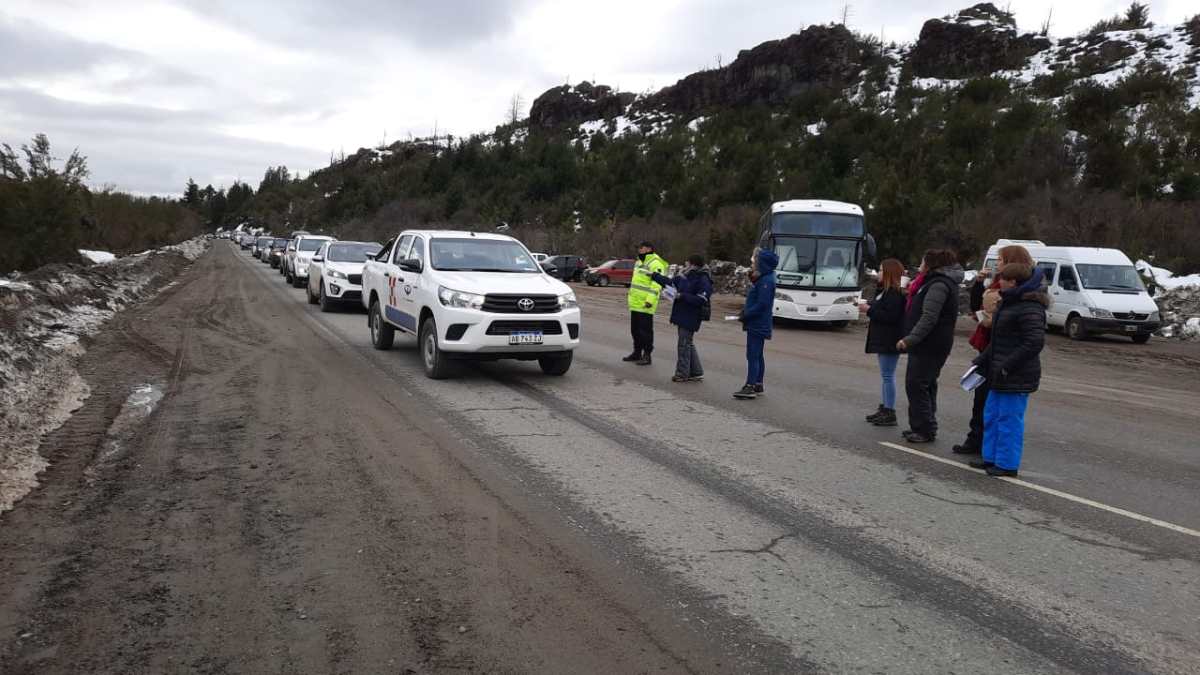 El gremio de Comercio en Bariloche entrega panfletos a los automovilistas en el acceso al cerro Catedral para expresar su reclamo por condiciones laborales y salariales. Foto: Gentileza