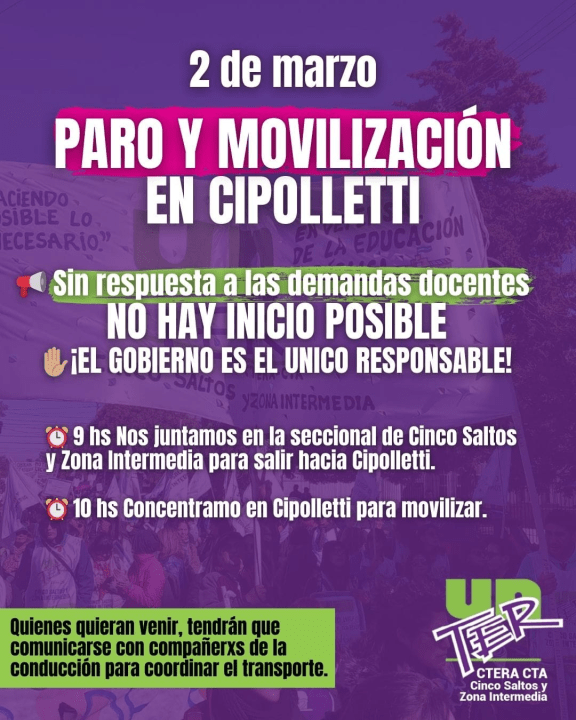 Según detallaron desde el gremio docente Unter, este lunes la convocatoria está prevista para las 10 en el Centro Cultural de Cipolletti, ubicado en el ingreso a la ciudad. Desde allí, las seccionales de Cipolletti, Cinco Saltos y Roca marcharán a los puentes carreteros.
