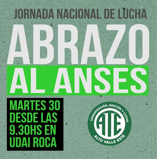 Hoy integrantes de la Asociación de Trabajadores del Estado (ATE) se movilizaron hacia la oficina de Anses de la ciudad de Roca y junto a otras organizaciones y sindicatos realizaron un abrazo simbólico en rechazo a los despidos y el cierre de oficinas en Río Negro.