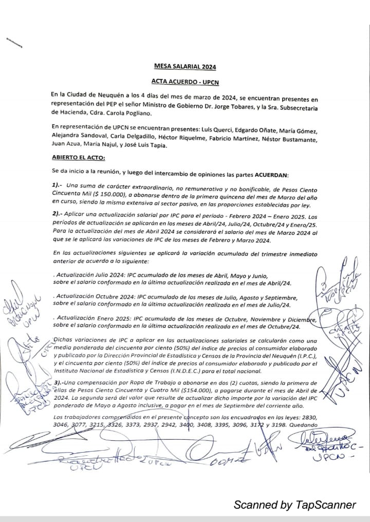 Por su parte, esta tarde se conoció que UPCN aceptó el ofrecimiento del Gobierno. Esta tarde, durante una asamblea, se firmó un acta de acuerdo con el ministro de Gobierno, Jorge Tobares, y la Subsecretaria de Hacienda, Carola Pogliano.