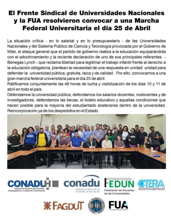 La actividad fue convocada por el Frente Sindical de Universidades Nacionales y la Federación Universitaria Argentina (FUA) y tendrá lugar el próximo jueves 25 de abril.