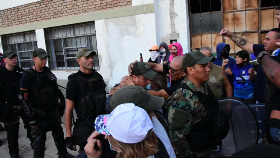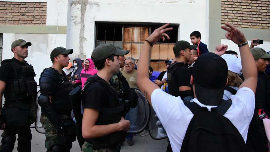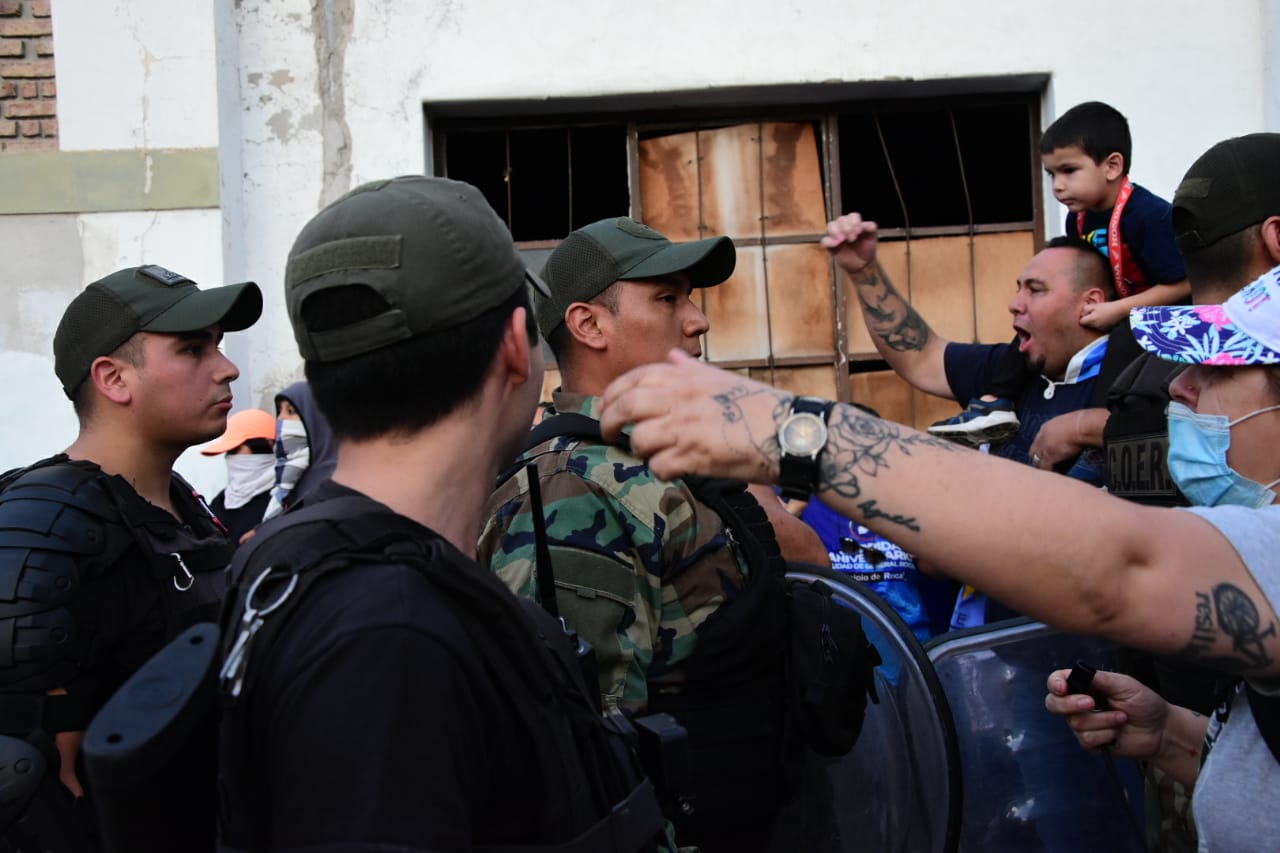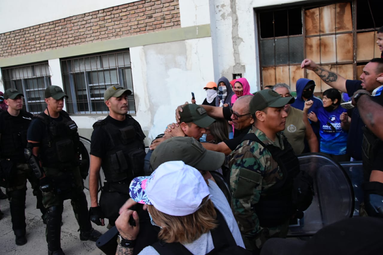 «Un cordón humano les impide el paso. Algunas son mujeres, otros familiares, retirados y algunos están encapuchados», dijo el periodista de RIO NEGRO, Benjamín Ríos quien se encuentra en el lugar de los hechos.