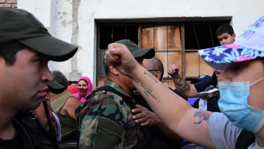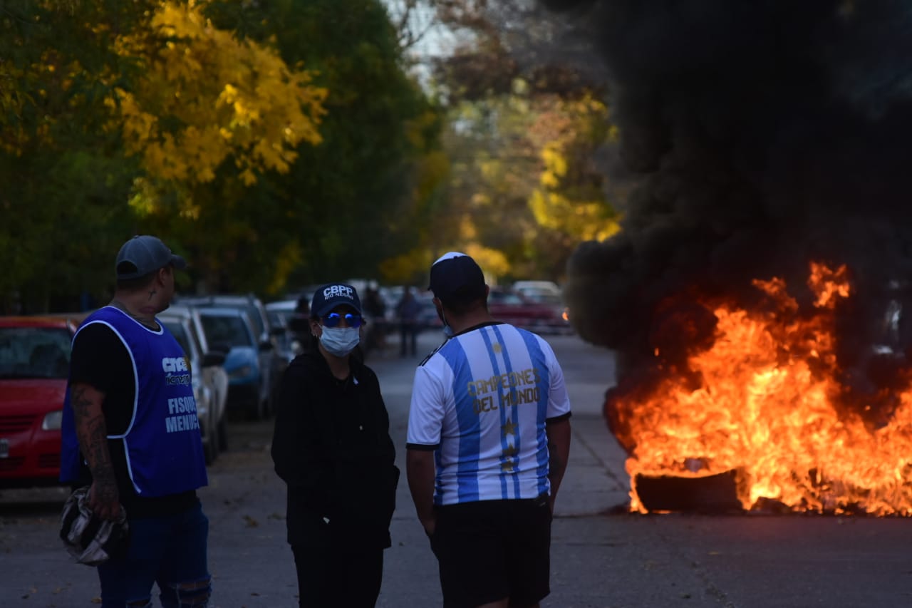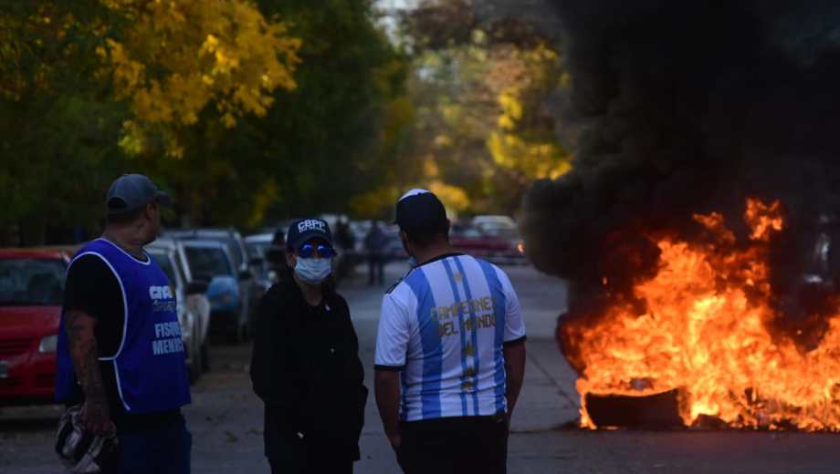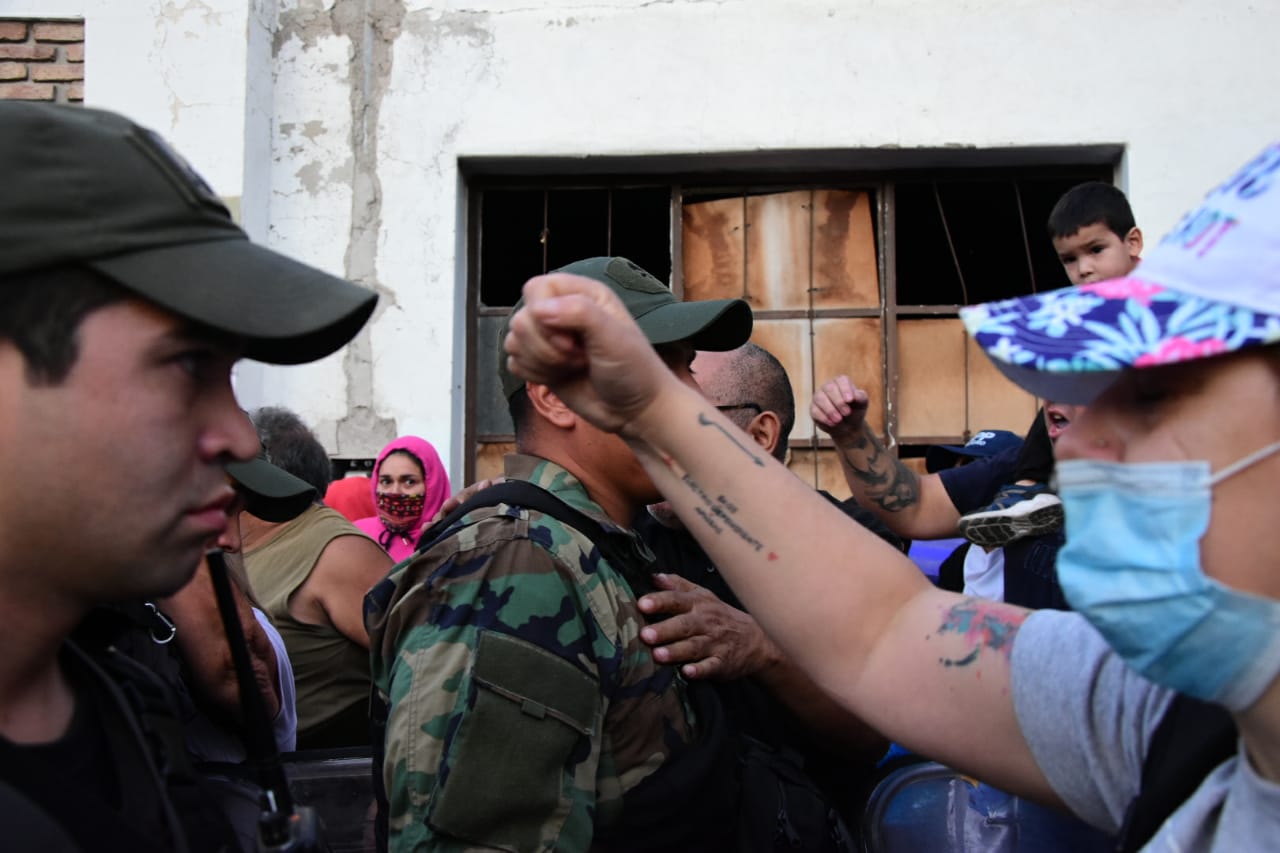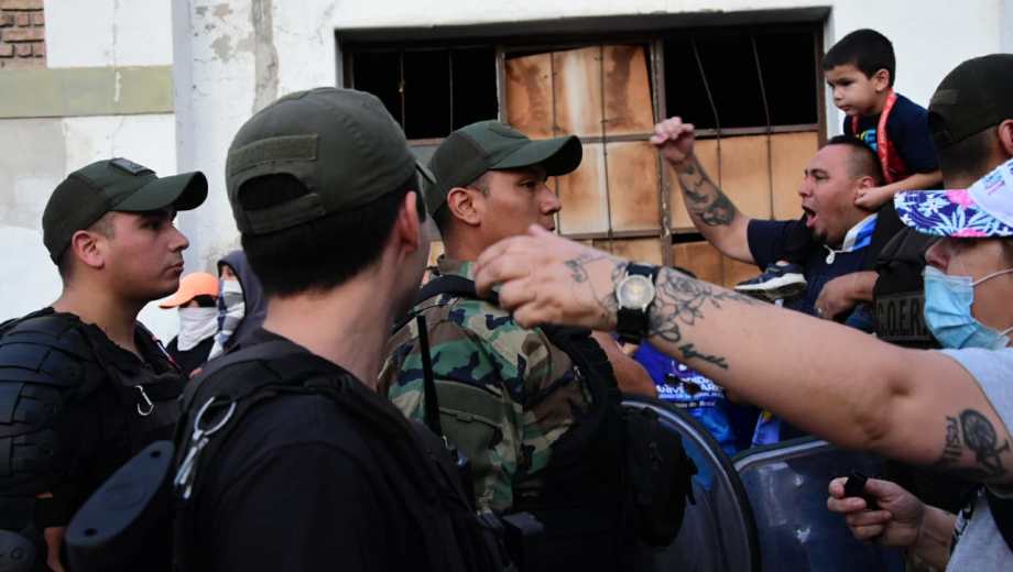 «Un cordón humano les impide el paso. Algunas son mujeres, otros familiares, retirados y algunos están encapuchados», dijo el periodista de RIO NEGRO, Benjamín Ríos quien se encuentra en el lugar de los hechos.