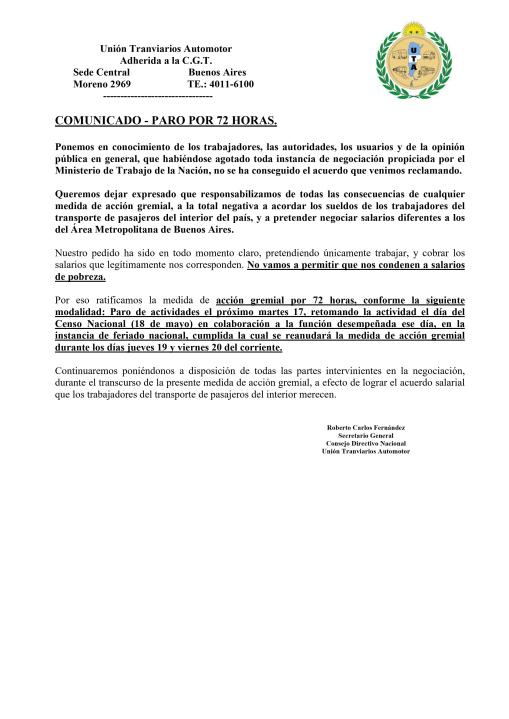 Después de que volvieran a fracasar las negociaciones con las empresas, la Unión Tranviarios Automotor (UTA) ratificó el paro de 72 horas para esta semana pero no se afectará el día del Censo Nacional, el miércoles.
