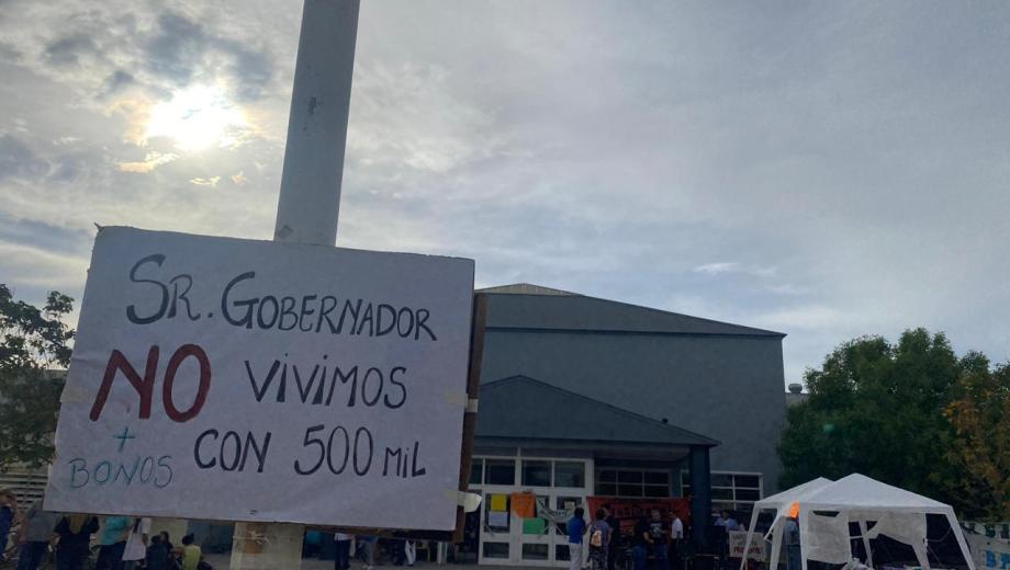 Por su parte, en Chichinales, mientras los trabajadores esperan la reunión, están reclamando con bombos frente al hospital local.
