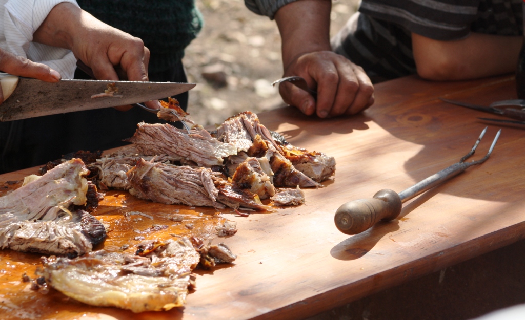 Los minutos pasan entre risas y aplausos. El costillar se acuesta sobre la tabla, chorreante y brilloso. Al cortar costilla por costilla, se dibuja una sonrisa cargada de felicidad en el rostro del Lagar. Ha culminado su obra de arte. Un placer inigualable repartir a cada comensal ese producto que creó desde muy temprano.