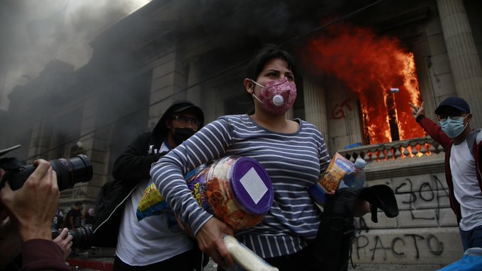 Esta tarde, varias personas rompieron ventanas del Congreso y lanzaron artefactos que originaron fuego dentro del edificio, según el diario Prensa Libre, hasta que fueron reprimidos por la policía.
