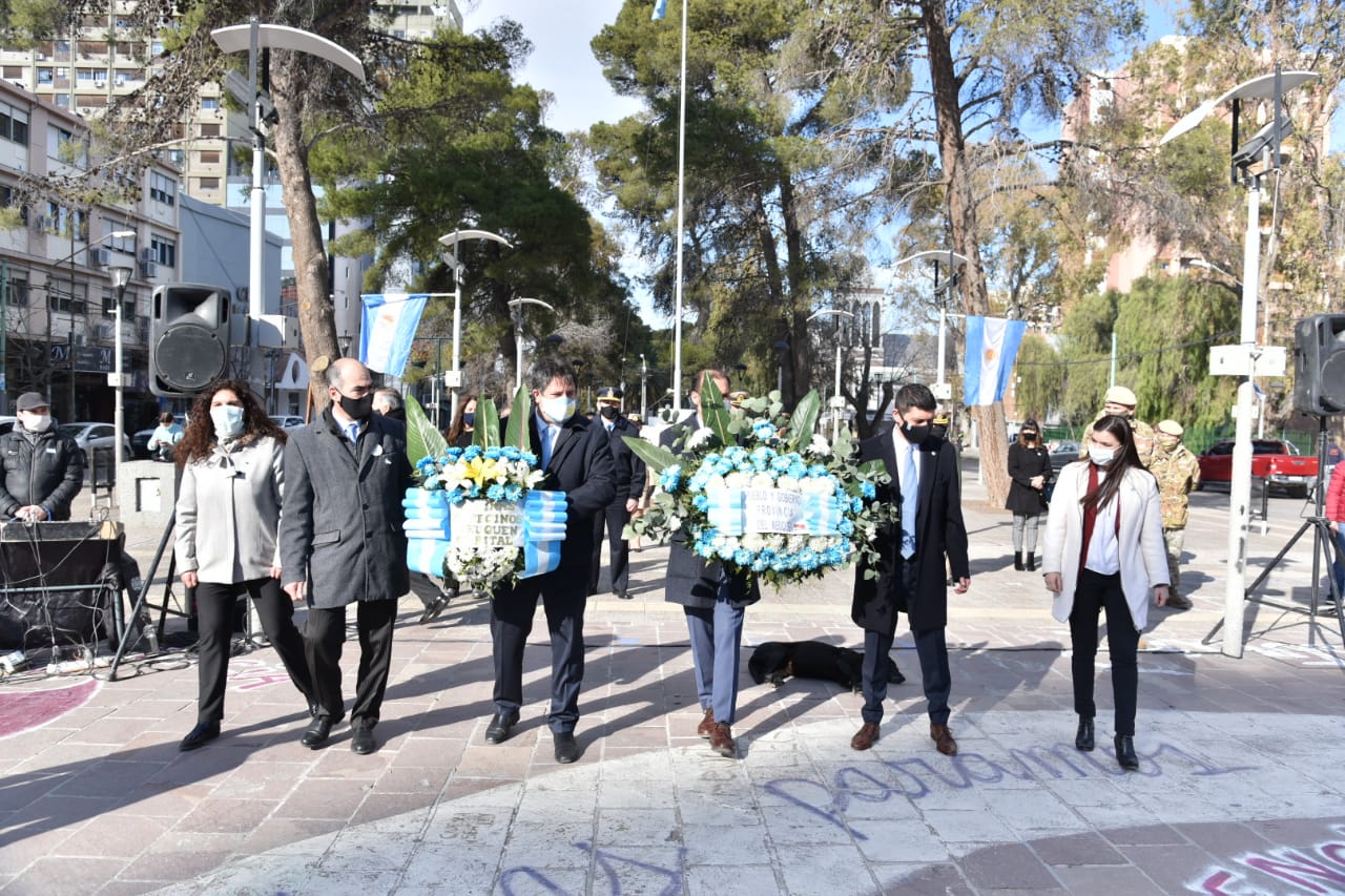 En el evento participaron el gobernador, Omar Gutiérrez; su vice, Marcos Koopmann; la ministra de Gobierno y Seguridad, Vanina Merlo, y el intendente capitalino, Mariano Gaido. Sin embargo, no hubo discursos, sino una semblanza de San Martín y una ofrenda floral.