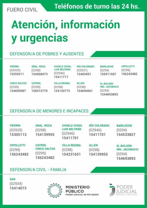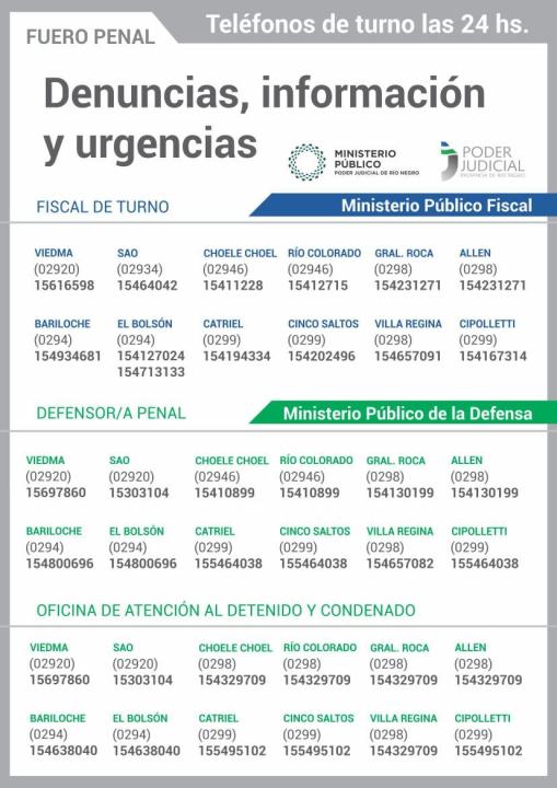 El Ministerio Público de la Provincia de Río Negro garantiza la atención de Fiscales y Defensores /as de turno tanto penales como civiles y de familia las 24 horas, todos los días de la semana. En estos números de teléfonos se realizará la recepción de denuncias y la atención de urgencias.