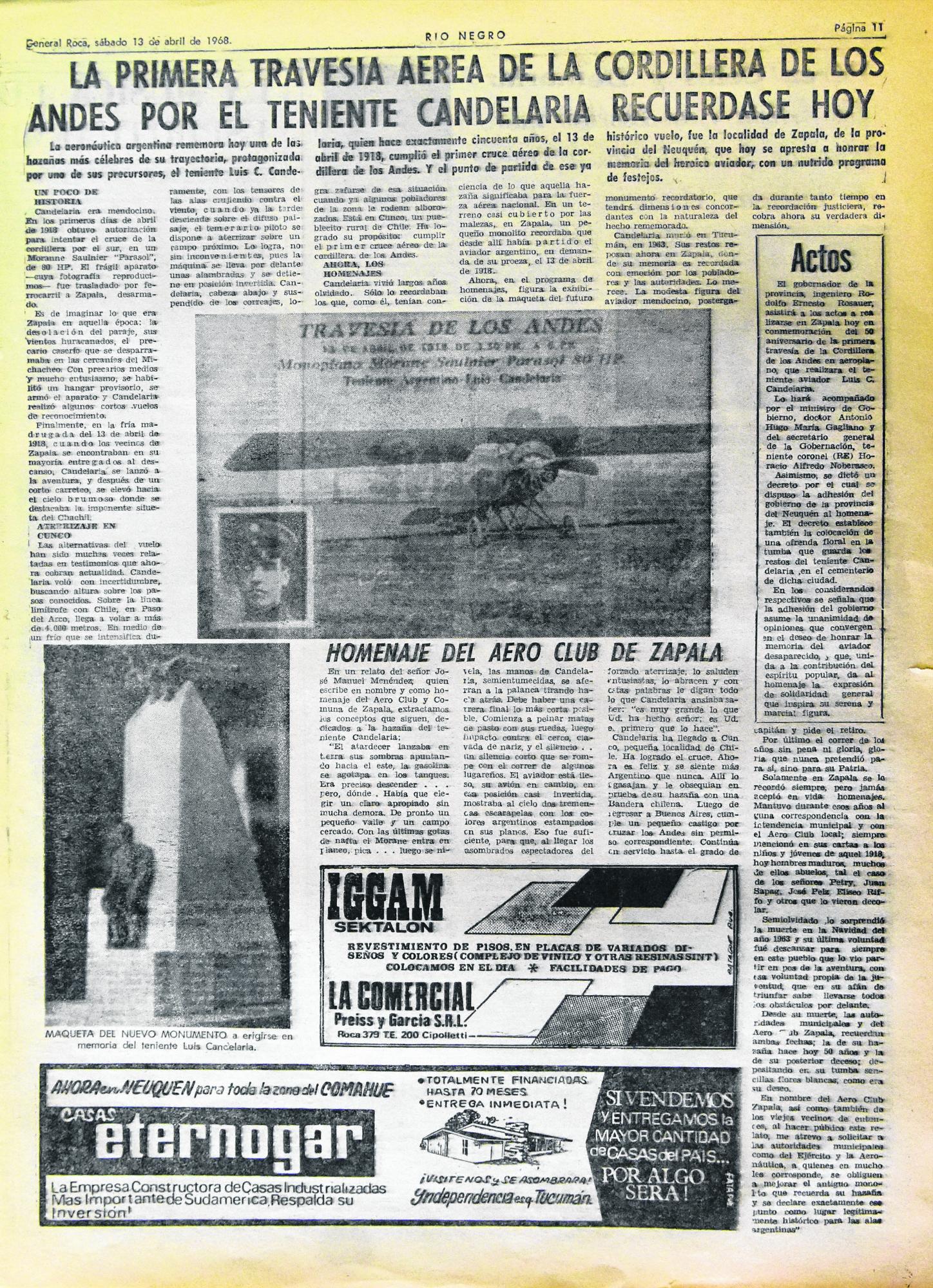 50 años de la hazaña de Candelaria, este diario dedicó una página a recordarlo. Zapala lo homenajeó con orgullo, igual que ahora que se cumplen 100 años.