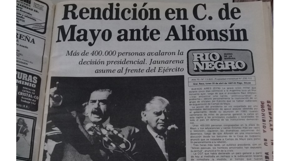 "Una multitud jamás vista en la historia de la provincia se movilizó (…) resueltamente dispuesta a ratificar su compromiso con los valores de la Democracia", publicó "Río Negro" en su tapa, al día siguiente de semejante acontecimiento.