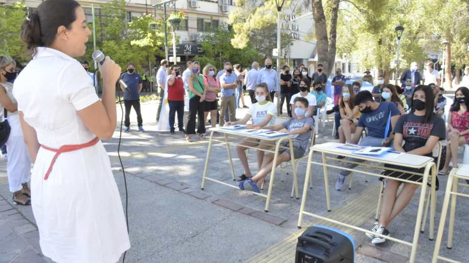 Este martes a las 11, el monumento a San Martín en Neuquén lucó diferente. Es que desde Juntos por el Cambio impulsaron un reclamo para que el gobierno neuquino garantice las clases presenciales en el ciclo lectivo 2021. Montaron un aula de clases a cielo abierto.