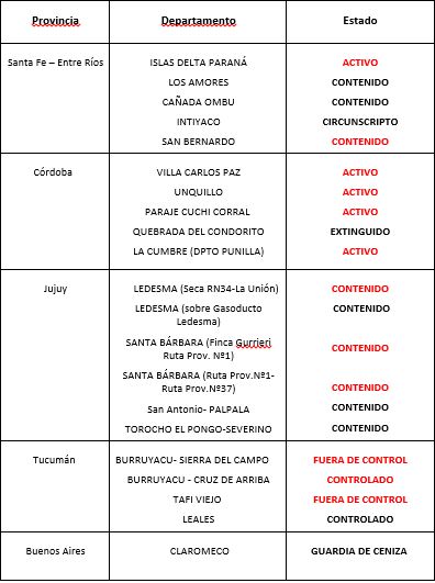 El Servicio Nacional de Manejo del Fuego (SNMF) informó que en 13 provincias se registran incendios forestales, aunque se encuentran en diferentes estados. En Catamarca y Tucumán se registran focos fuera de control y en las demás regiones se distribuyen entre activos y contenidos. Las hectáreas afectadas se cuentan de a miles.
