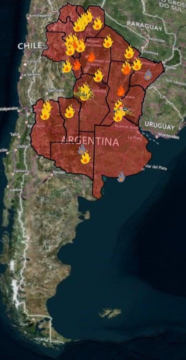El Servicio Nacional de Manejo del Fuego (SNMF) informó que en 13 provincias se registran incendios forestales, aunque se encuentran en diferentes estados. En Catamarca y Tucumán se registran focos fuera de control y en las demás regiones se distribuyen entre activos y contenidos. Las hectáreas afectadas se cuentan de a miles.