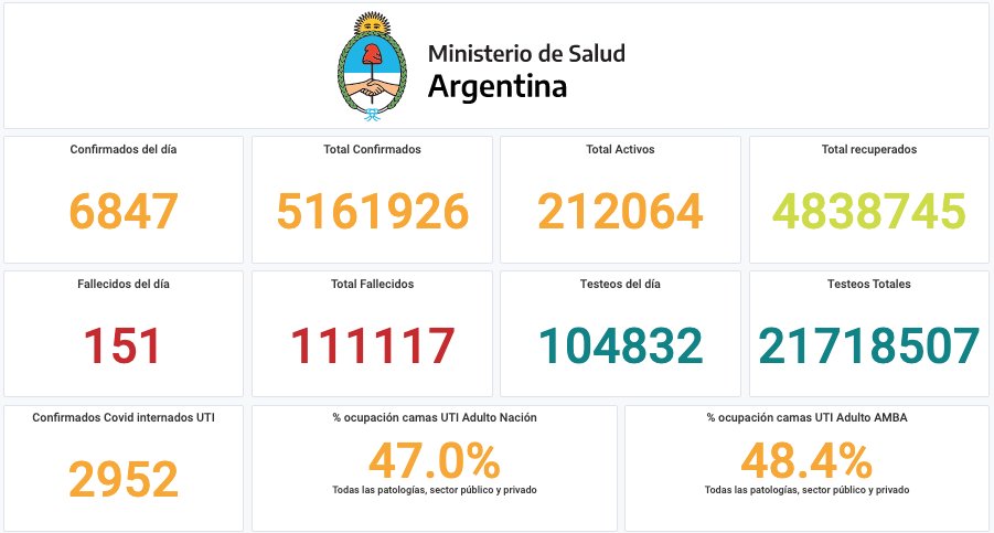 El Gobierno informó que en las últimas 24 horas se registraron 151 fallecidos por coronavirus. Con los últimos datos, la Argentina superó los 111.000 fallecidos desde que se inició la pandemia. El dato positivo de la jornada fue que por primera vez en varios meses la cantidad de pacientes en terapia intensiva cayó por debajo de los 3.000 casos, a 2.952 enfermos graves.