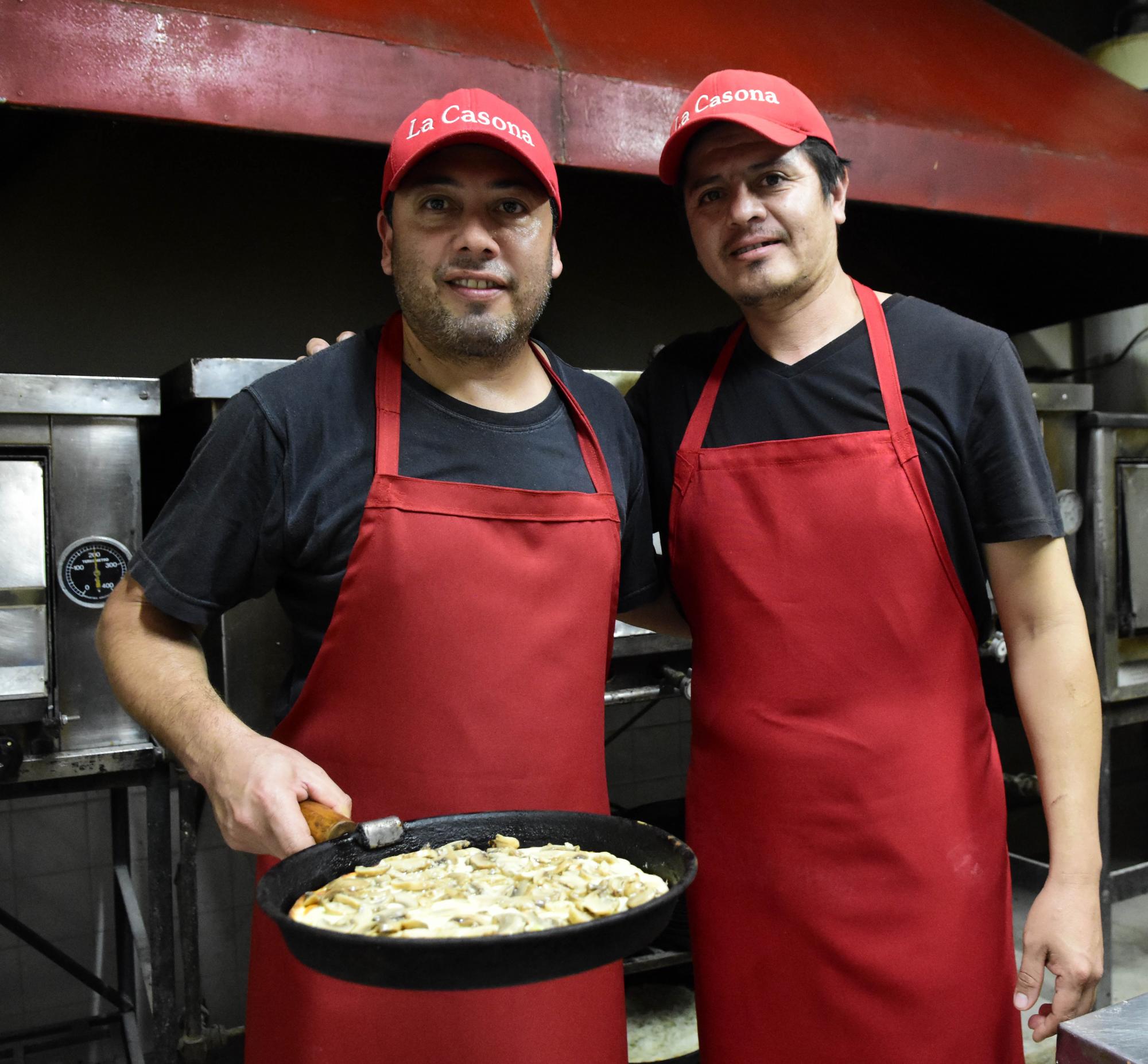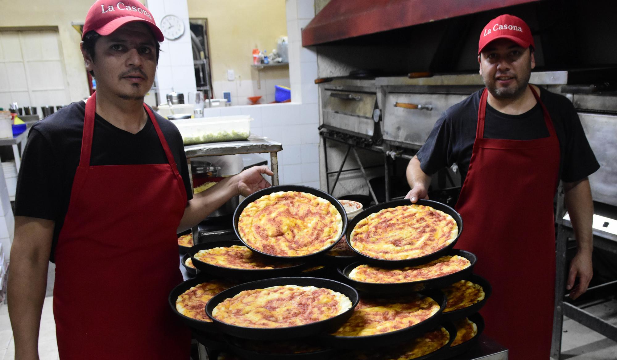 Fabián y Julio son los maestros pizzeros de La Casona; ambos tienen 6 ayudantes en total. En equipo ofrecen 43 variedades de pizzas, más empanadas y ensaladas. “Por ahí viene un grupo y alguien no puede comer harina. Entonces tiene una opción veggie: ensaladas de rúcula, jamón crudo, queso azul, cherry y aceitunas negras; tomate, palmito, huevo y atún; rúcula, champignones, queso en hebras y nueces, entre otras.