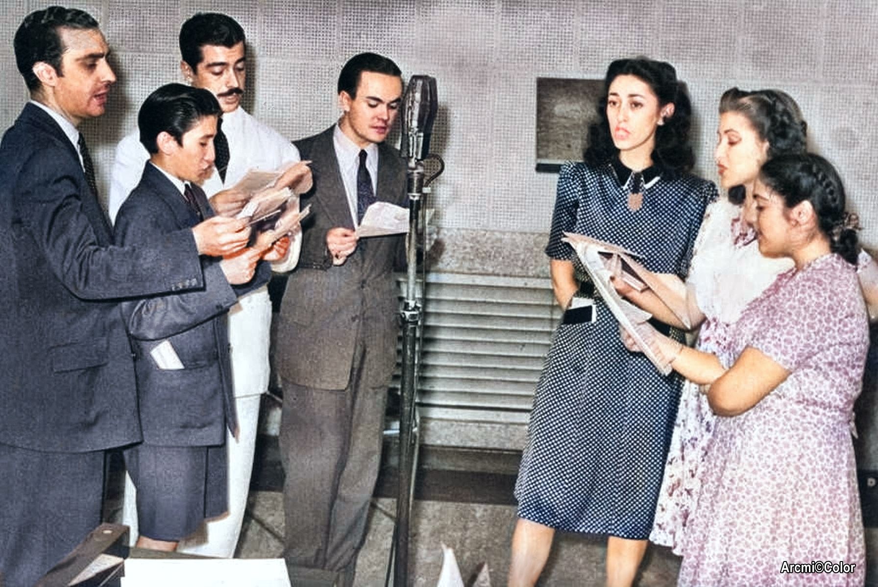 Hilda Bernard (con vestido a lunares) en una de sus tantas participaciones en los radioteatros.