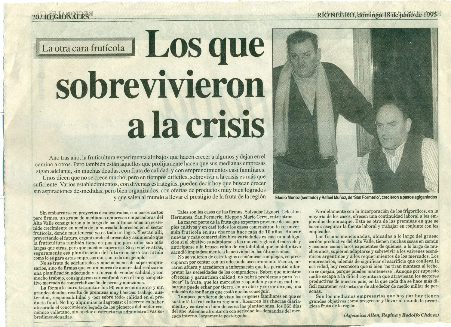 Luego llega la retirada de las fábricas de tomate y con el la salida del cultivo para esta familia. En 1979 deciden incursionar en la fruticultura, fundando su primer frigorífico y un pequeño galpón de empaque, en la misma chacra a la que llegaban 29 años atrás. En 1992 fundaron San Formerio SRL en ese mismo lugar, sobre Ruta 65.