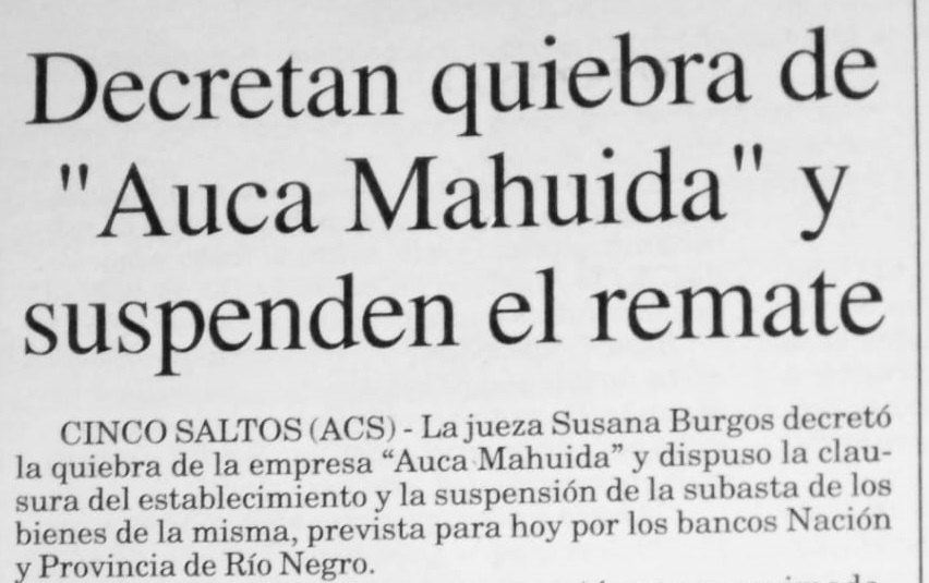 09 de marzo de 1994: La jueza Susana Burgos decretó la quiebra de la empresa “Auca Mahuida” y dispuso la clausura del establecimiento y la suspensión de la subasta de los bienes de la misma.