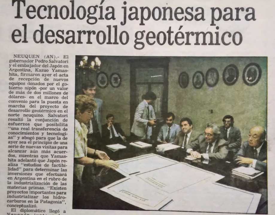 El entonces gobernador Pedro Salvatori y el embajador de Japón en Argentina, Kazuo Yamashita, firmaron el 6 de marzo de 1989 el acta de recepción de nuevos equipos donados por el gobierno nipón -por un valor de más de dos millones de dólares- en el marco del convenio para la puesta en marcha del proyecto de desarrollo geotérmico en el norte neuquino. Salvatori resaltó la conjunción de esfuerzos que posibilitarían “una real transferencia de conocimientos y tecnologías” y abogó para que este acto sea el inicio de otros acuerdos que puedan derivar de esta iniciativa.