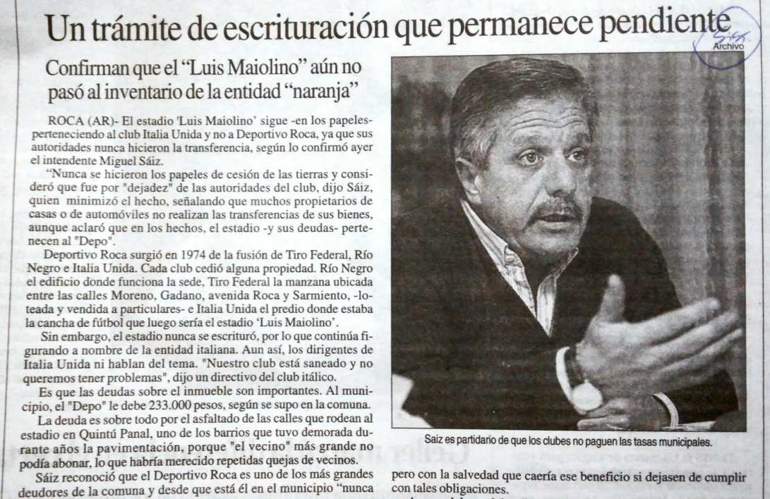 26 de junio de 1997: El intendente Miguel Sáiz informa que el estadio “Luis Maiolino» seguía -en los papeles- perteneciendo al club Italia Unida y no a Deportivo Roca, ya que sus autoridades nunca hicieron la transferencia.