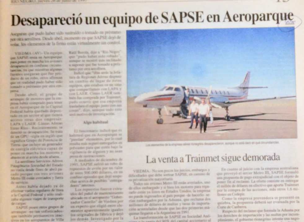 25 de junio de 1997: Un equipo que la empresa SAPSE -que estaba sin operar- tenía en Aeroparque para poner en marcha los aviones desapareció en confusas circunstancias.