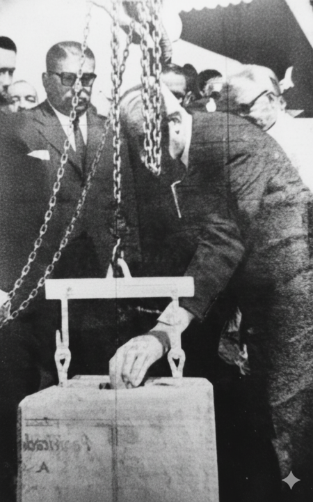 El presidente Arturo Illia coloca la piedra fundamental del puente en octubre de 1964 (Archivo Diario Río Negro)