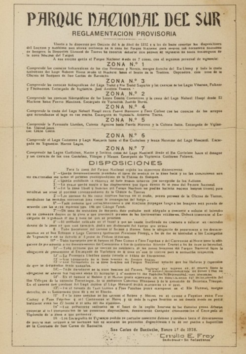 - 1922: Bajo el mandato de Hipólito Yrigoyen, el proyecto tomó escala regional. Se creó el Parque Nacional del Sur, con una superficie colosal de 785.000 hectáreas (unos 530 $km^2$ de zona núcleo). El ingeniero y geógrafo Emilio Frey fue designado su primer director.